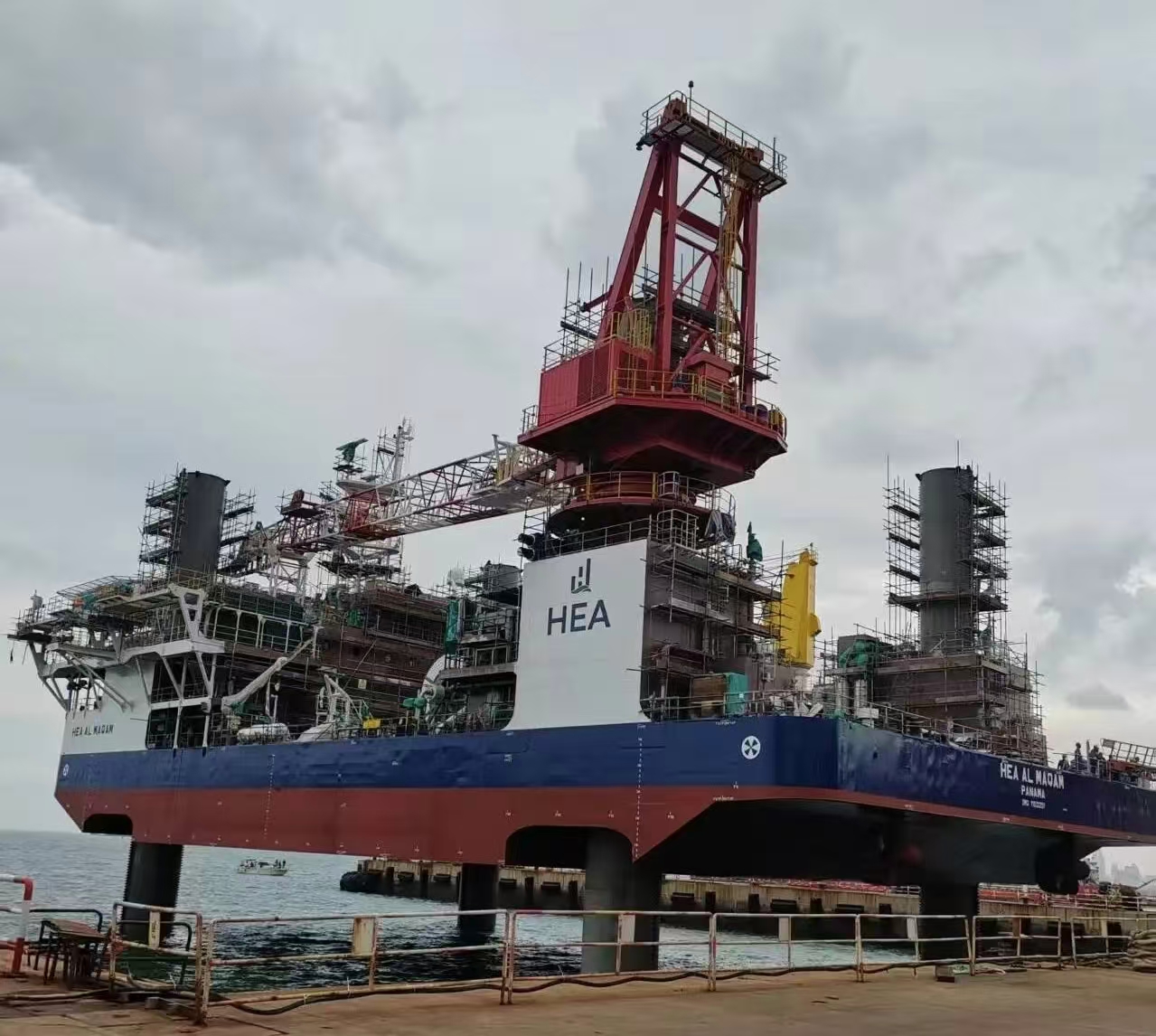9月27日,TYPE3 PRO第二座自升式海上作業支持平臺下水后,經過升降系統調試,四條樁腿平穩扎進海底實現了平臺站樁,隨后開展了平臺樁腿接長工作。
